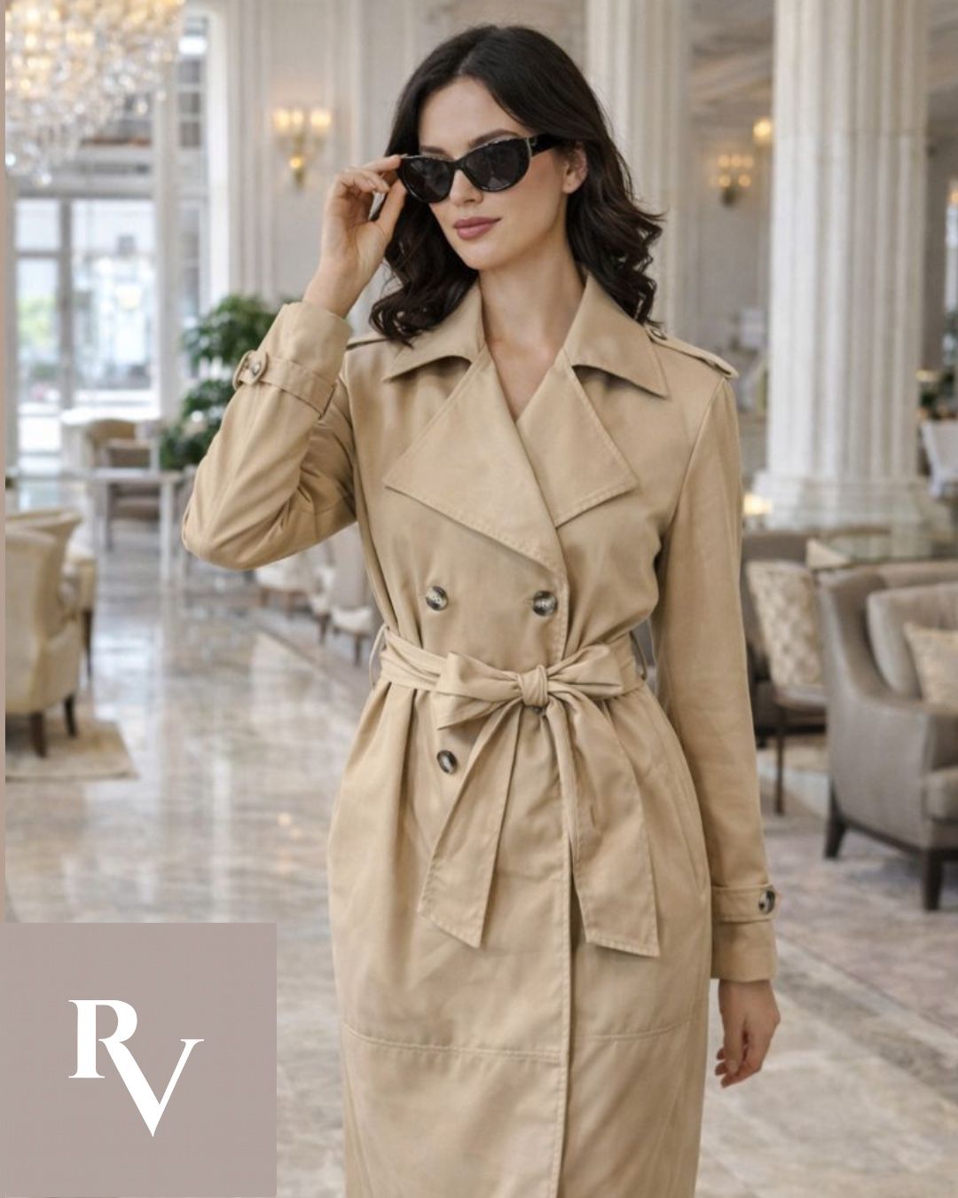 La chaqueta estructurada, ceñida con lazo a la cintura, define sin imponer; la falda lápiz, de caída precisa, acompaña el paso firme de quien sabe a dónde va. El pañuelo en el cuello —detalle clásico— eleva el conjunto y le otorga ese aire atemporal que distingue a las piezas que no pasan, permanecen.